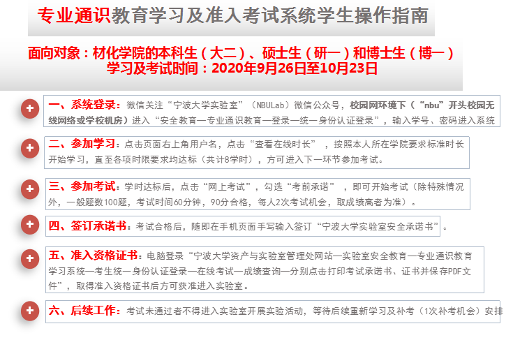 实验室管理专项目标考核的要求,每一位需要进入实验室学习和工作的师生必须进行实验室安全的在线学习、考试,成绩合格方可进入实验室工作学习(准入制),考核未合格的学生严禁进入实验室,其名单将在2048核基地