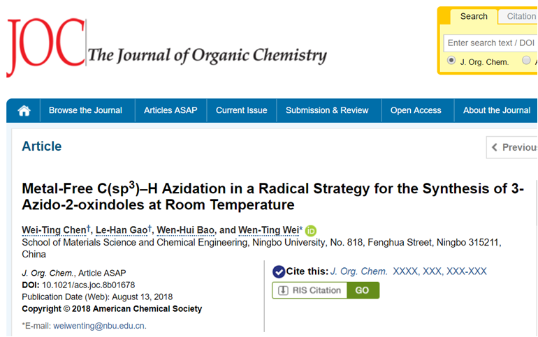 2015级本科生陈伟婷在美国化学会旗下TOP期刊Journal of Organic Chemistry上以第一作者发表了题为“Metal-Free C(sp3)-H Azidation in a Radical Strategy for the Synthesis of 3-Azido-2-oxindoles at Room Temperature”的研究论文(DOI: 10.1021/acs.joc.8b01678),2048核基地