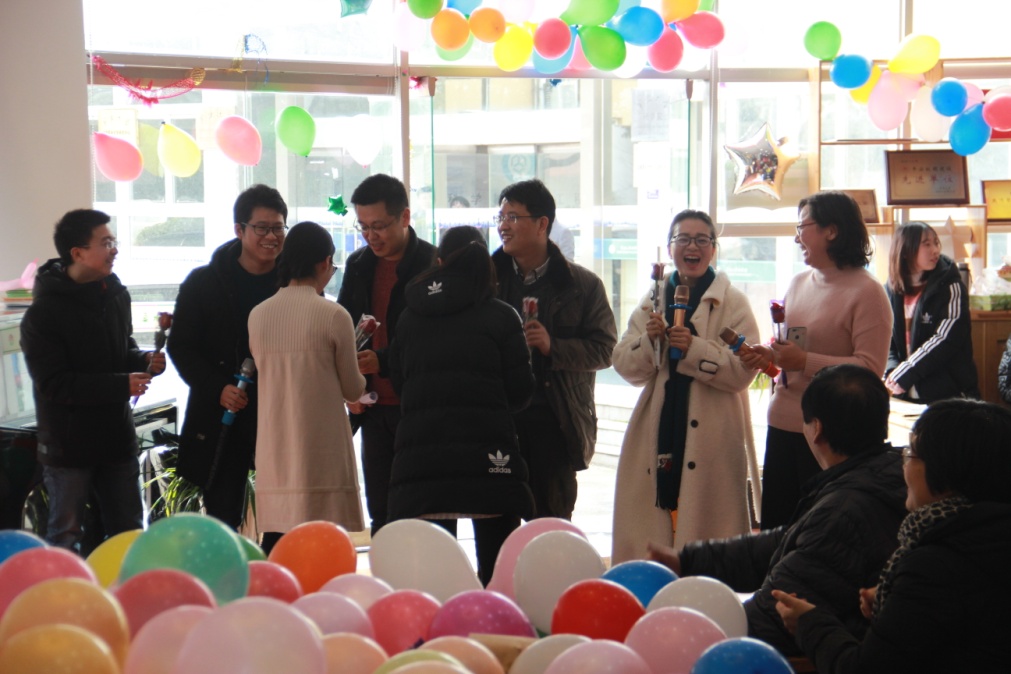 第二个环节是各系所和部门的文艺表演并穿插游戏和抽奖活动。化学系的合唱《一剪梅》,无机所朗诵的《面朝大海,春暖花开》,应化系奉献的《五月的鲜花》和《南屏晚钟》展示了平时和实验室瓶瓶罐罐打交道的老师们诗情画意的另一面。由各部门选两个代表参加的游戏“踩气球”和“爱的抱抱”掀起了茶话会的小高潮,平时认识、交流机会不多的老师和不少新引进的老师有了一个认识和互动的平台。实验中心倾情演唱《爱》,高分子系高歌一曲《沧海一声笑》,年代感十足,在致敬小虎队和缅怀金庸先生的歌声中,我们不禁感慨时光飞逝,同时也提醒大家应更加珍惜每个当下。行政团队表演的《我的材化,我的祖国》将严肃的朗诵与爆笑的三句半表演结合来表达满满的家国情怀。在改革开放四十周年的大背景下深情赞美《我的祖国》,以三句半的表演形式诙谐地总结了学院2018各方面的成绩,并对全院上下表达了真诚祝福。教职工子女演唱的《妈妈宝贝》充满了童趣和天真,让我们看到了教师家庭和睦,看到了小家和大家的未来。