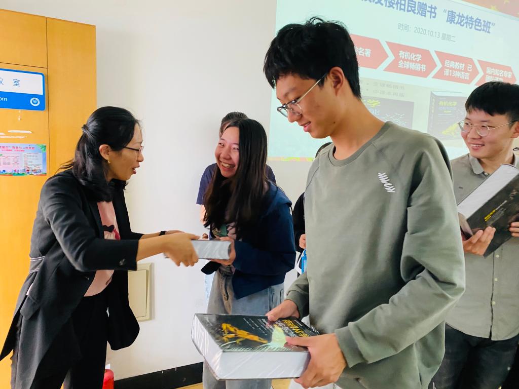 校友楼柏良博士从北京专程寄来《有机化学:结构与功能》全球畅销书,赠送给学院第一、第二届全体“康龙特色班”的同学们。赠书活动会上,学院学生工作负责人介绍了该书籍在化学领域的巨大影响力,希望同学们不辜负校友的殷切期望,充分发挥该书在学习和考研中的作用,为推动行业更好发展而努力。随后,开展了康龙特色班学习科研座谈会,学生分享了近期取得成绩和下阶段的努力方向。