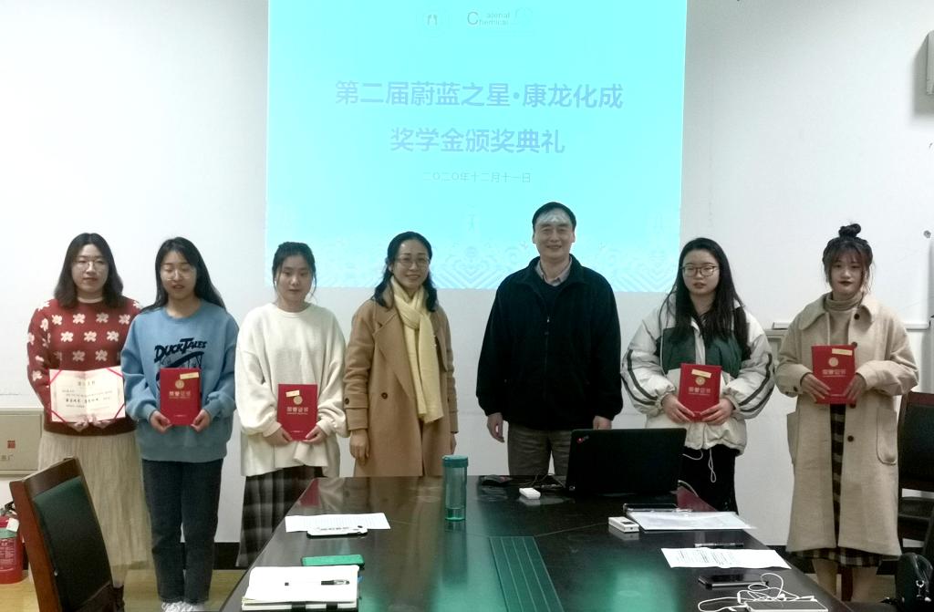 历届康龙特色班同学在创新创业、科研实践等方面取得的成绩,并代表学院向康龙化成有限公司慷慨捐赠表示感谢,向康龙化成创始人、78级校友楼柏良博士提携后辈表示感谢。唐科奇宣读了第二届“蔚蓝之星·康龙化成”获奖学生名单,并给五位同学颁发获奖证书。