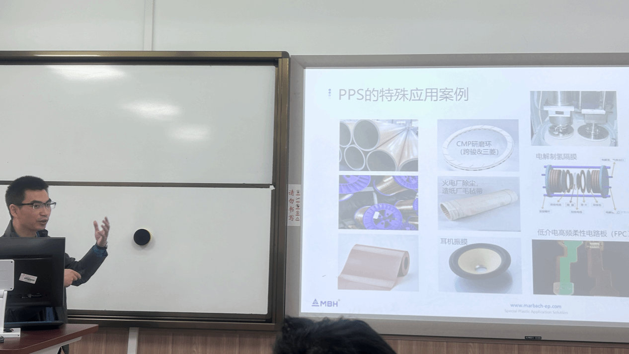 ,为2022级材料专业的学生们带来了一场关于特种工程塑料加工及市场应用的专题报告,报告在北校区3-208教室举行。特种工程塑料是指综合性能优异,长期使用温度在200℃以上的一类工程塑料,主要应用于电子电气、特种工业、航空航天、军工等高端领域。万总详细讲述了当前国内外市场上主要使用的特种工程塑料,包括聚苯硫醚(PPS)、聚酰亚胺(PI)、聚醚醚酮(PEEK)、液晶聚合物(LCP)等,加工成型方式和国内外市场发展现状。为了让材料专业的同学能将课堂学习的理论基础知识合理运用到工业生产过程的优化和产品性能的升级,万总经理通过经典实用案例分析的方式深入讲解了特种工程塑料产品的设计方案。