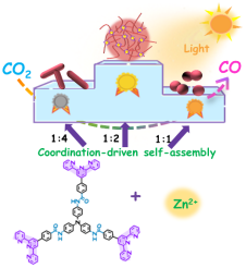 该工作通过调整金属锌离子和三足三联吡啶配体的比例,以配位驱动自组装方式,在金属与配体的配位、氢键和π-π堆积的作用下,分别得到了球形纳米颗粒、纤维状凝胶和微米棒三种形貌的配位超分子催化剂。其中,凝胶表现出最好的光催化效果,在光敏剂4CzIPN的协助下,可将CO2选择性还原为CO,生成速率为6.3 mmol g-1 h-1,选择性为94.7%。实验研究发现,凝胶催化剂与光敏剂分子之间的电子转移效率比另外两种形貌的催化剂更有效,得到电子被还原后生成的配体阴离子也更稳定,表明凝胶的纤维网络结构有助于催化性能的提高。该工作是在晁多斌课题组前期工作基础上完成的(Chemical Engineering Journal, 2022, 429, 132348;Nano Research, 2022, 15, 5902-5911; Chemical Communications, 2022, 58, 7972-7975)。