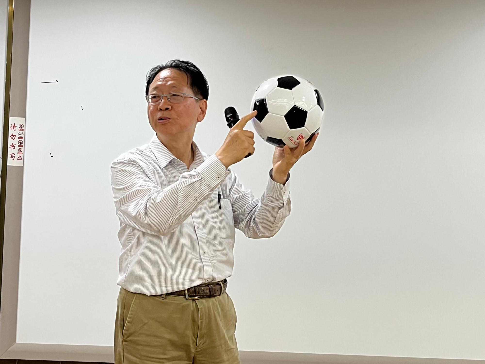 郑院士师从著名化学家、1996年诺贝尔化学奖获得者斯莫利(R.E.Smalley)教授,长期从事原子团簇科学研究。他从基础理论切入,结合留学科研时的经历,深入浅出地为学院师生们解释了原子团簇的相关问题,阐述了纳米材料与原子团簇的区别。随后,郑院士用足球做教具,生动形象地讲解了C60的结构和原子团簇研究进展,展望了学科发展的前景。