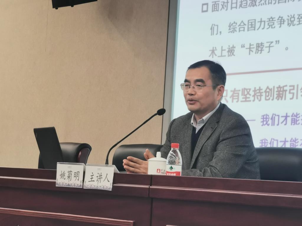 课程伊始,姚菊明以“深入学习贯彻习近平总书记关于教育的重要论述,为新时代培养更多创新人才”为主题,首先从创新是引领发展的第一动力出发,介绍了经济社会发展的主要模式,强调创新引领发展是时代进步的迫切需要。