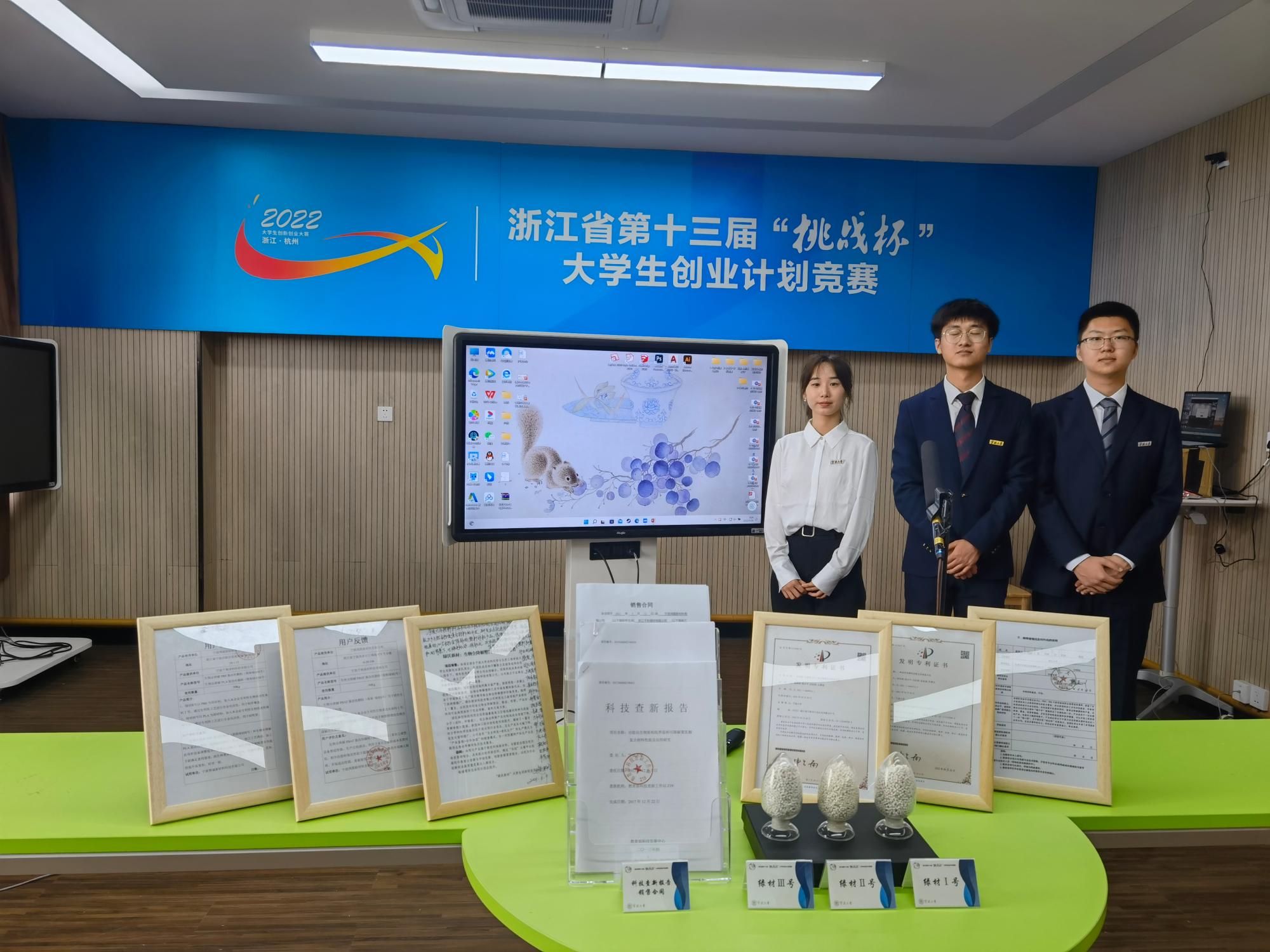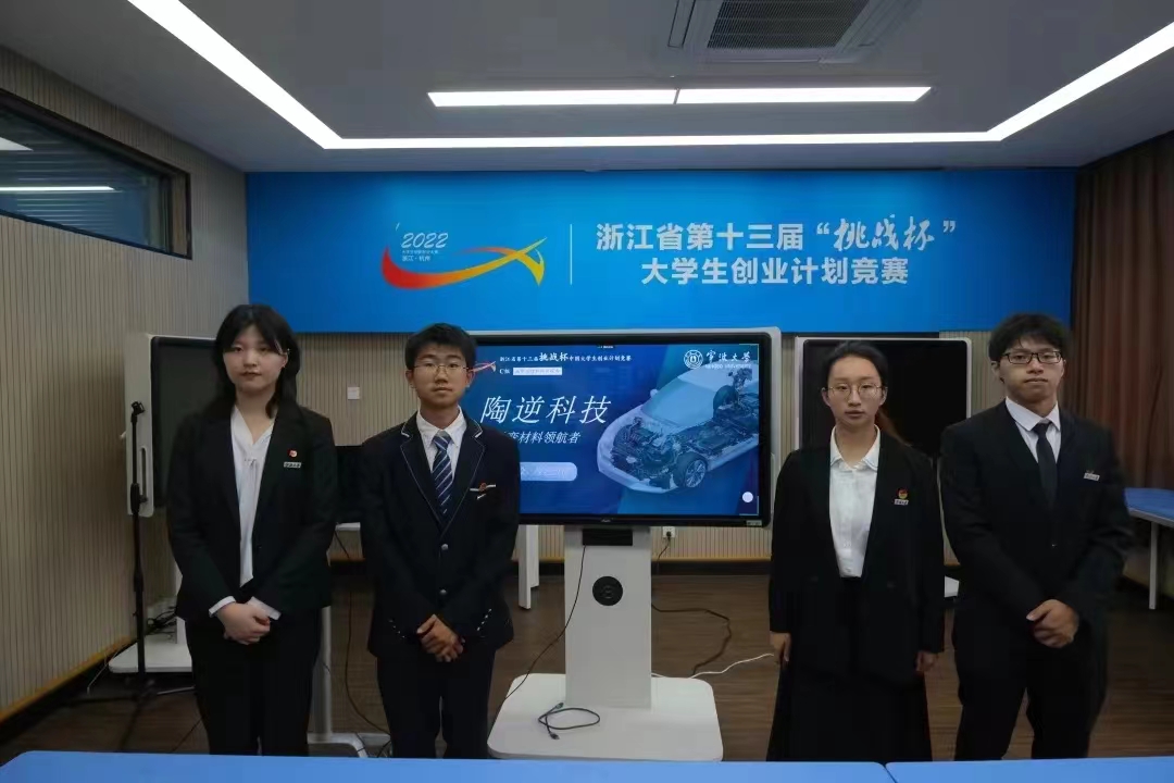 吴鲁康、翟一赞等同学参与的项目《陶逆科技——车用逆变材料领航者》获得城市治理和社会服务组金奖,由孔英祺、张家溪等同学参与的项目《争做不“塑”之客——生物全降解产品原料开拓者》以及由吕沛、董雪婧等同学参与的项目《隽研科技——高效脱氮污水处理专家》获得生态环保和可持续发展组银奖。