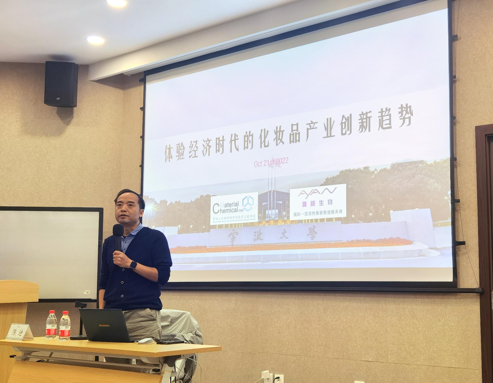 10月22日下午,浙江雅颜生物科技有限公司首席科学官、研发总监陈迪在杨咏曼楼作主题为“体验经济时代的化妆品产业创新趋势”的精彩讲座,材化学院50余名同学参加。
