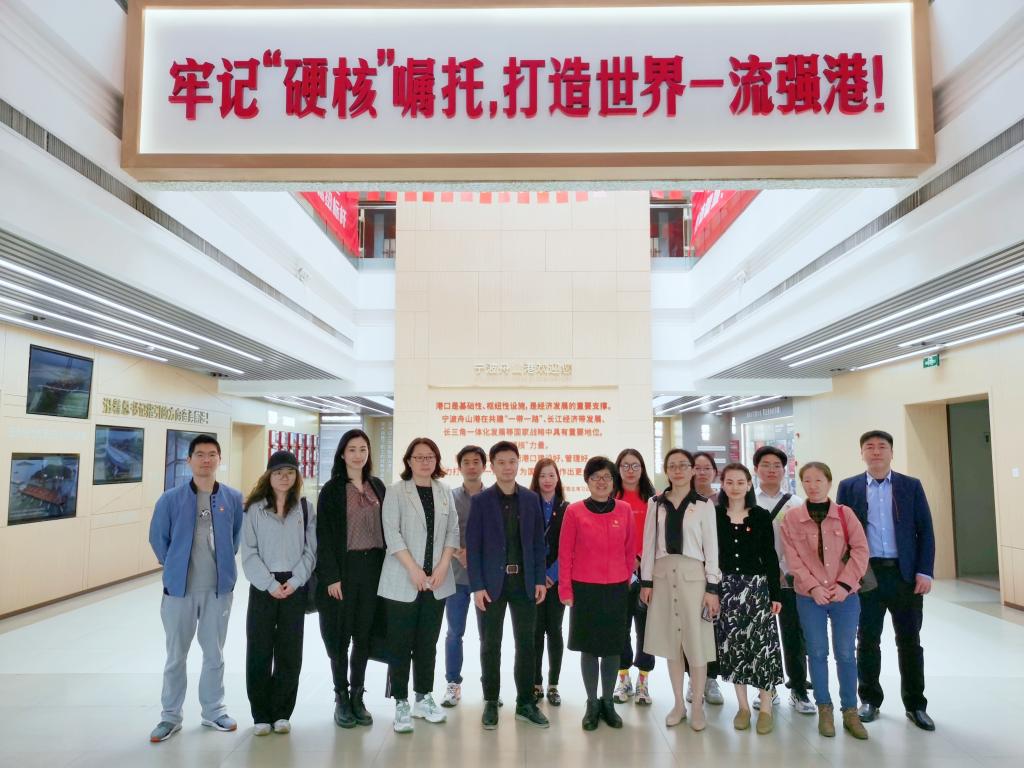 领略一流强港风采,迸发硬核力量。主题党日活动的第二站是宁波舟山港。党员们追随习近平总书记的足迹,来到货物吞吐量连续十二年位居世界第一的宁波舟山港。2020年3月29日,习近平总书记在浙江复工复产考察时,走访了宁波舟山穿山港区码头,亲切接见了职工代表,希望港口成员们能努力克服疫情影响,争取优异成绩。精彩的现场被摄影师定格后,以墙面大型图片展示在大家眼前。党员们逐一来到照片墙前,兴致勃勃地和习总书记“合影”。随后,党员们沿着习近平总书记的考察路线,乘坐同一部电梯,登上了环球航运广场顶楼的观景平台,眺望整个宁波舟山港,感受码头五彩的集装箱仿佛巨型积木,拼出连通世界的图景。