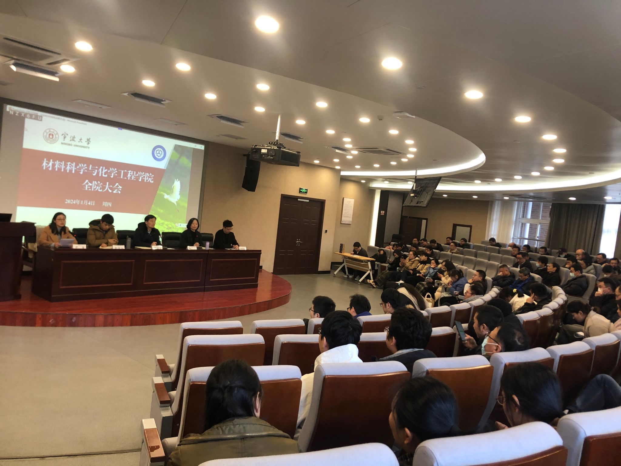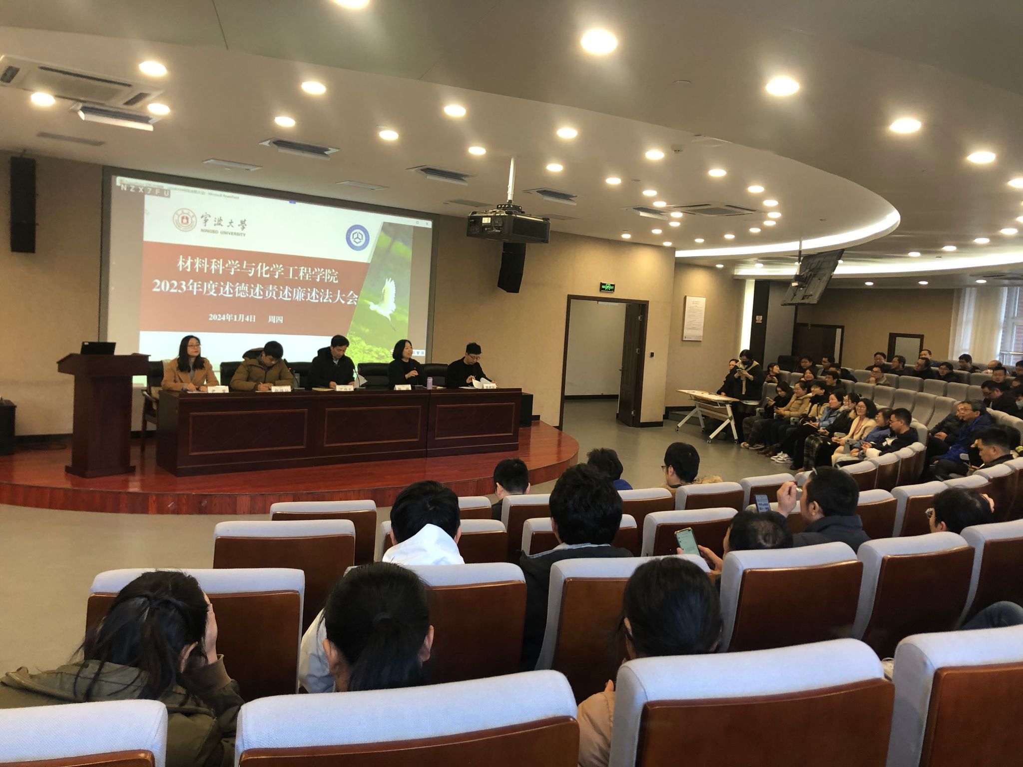 1月4日中午,2048核基地 在北区杨咏曼楼二楼会议室召开述德述责述廉述法报告会暨全体教职工大会。会议由院党委书记陶娟主持,学院党政班子、全体教职工参加会议。