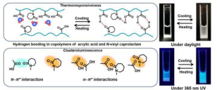 刺激响应性发光聚合物是一种在外界刺激下改变发光强度或波长的智能材料,在信息显示和生物传感领域有着广阔的应用前景。簇发光聚合物是一类新兴的发光聚合物,这些聚合物不含芳香基团,通过分子内的氧、氮、硫等杂原子和羰基、羟基等基团的聚集实现能量转移和荧光发射。探索刺激响应性和发光行为之间的关系、构筑新型的刺激响应性的簇发光聚合物成为当前发光聚合物研究的关键问题。该工作中,论文作者将强氢键给体—丙烯酸(AAc)与强氢键受体—乙烯基己内酰胺(NVCL)进行共聚,制备了具有簇发光功能和上临界溶解温度的温敏性聚合物。AAc-NVCL之间的氢键在低温下较为稳定使得聚合物链发生聚集,而在加热条件下可以解开使得聚合物溶解。这种温度响应性的链聚集同样影响了其发光行为:聚合物溶液在低温下可以发出更为明亮的蓝光。这种可调控的发光行为将扩展共聚物在传感和生物显象方面的应用。
