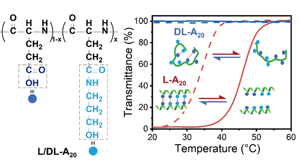 课题组研究人员通过NCA开环聚合制备了手性和内消旋的聚谷氨酸衍生物,这两种聚多肽展示出了截然不同的刺激响应行为。手性聚多肽的氨基酸残基通过形成协同的分子内氢键,形成螺旋结构,而螺旋结构又有助于聚多肽侧链之间形成协同的分子间氢键,能够在环境变化时发生可逆的断裂和重组。此研究展示了手性在聚多肽物理化学性质中的重要性,为新型多肽材料的合理设计提供了理论依据。该论文受到国家自然科学基金面上项目和浙江省自然科学基金一般项目的资助。