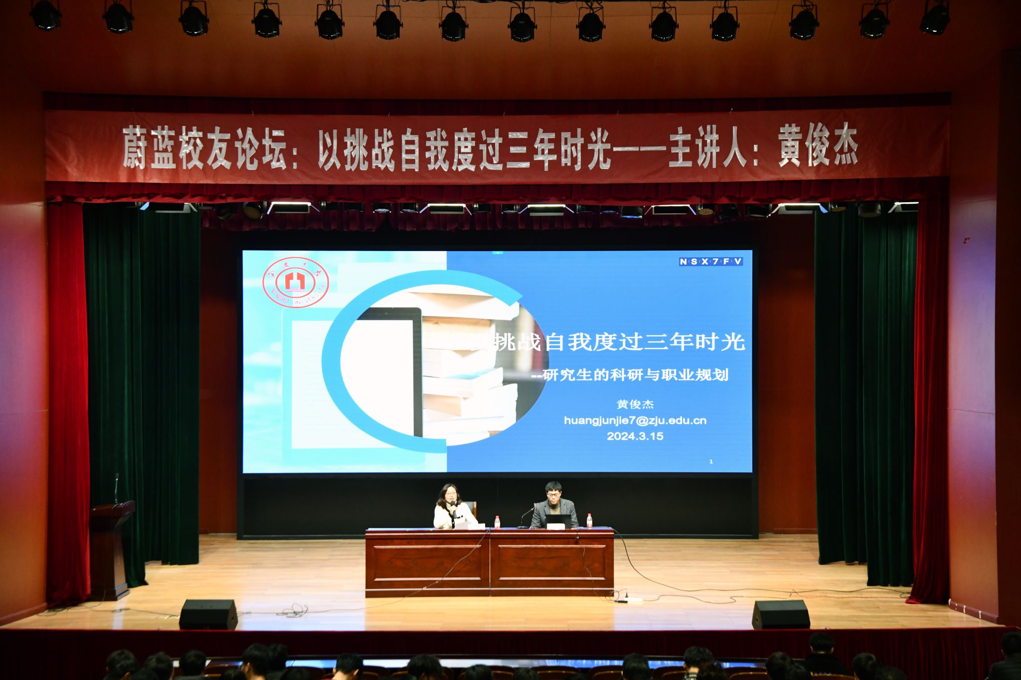 3月15日,2048核基地 在忻元甫报告厅举办蔚蓝校友论坛第一讲,2019级优秀校友黄俊杰应邀返校,以“以挑战自我度过三年时光”为主题为学院400余名2023级材料专业研究生上了一堂生动有趣的人文素养课。