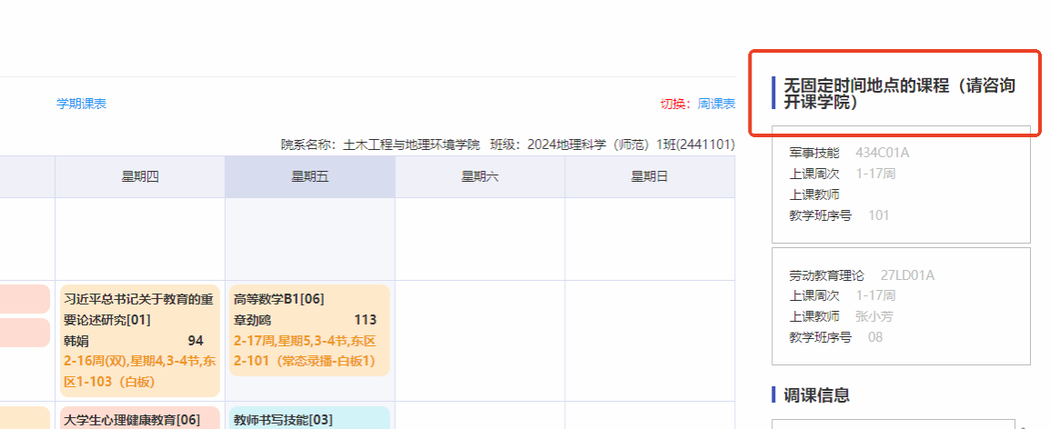 6、同学进入“我的课表”app查询课表的时候看到右上角有“无固定时间地点的课程(请咨询开课学院)”(如下图所示),此类课程具体上课时间、地点不在系统中体现,请选了此类课程的同学务必要联系该课程所在学院的任课老师,明确具体的时间和地点。