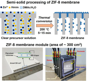 该研究提出一种简单高效的半态合工艺,实现了ZIF-8分子筛膜超快速(低至5分钟)、高产量(料液全利用)、高重复性合成。制备ZIF-8的丙烯/丙烷分离选择性高达190并在高温、高压下依旧保持优异分离性能,同时可实现实际工业气体的长时间高效分离。更重要的是,采用半干态合成工艺在未经任何修饰的商业化板式陶瓷载体上成功制备ZIF-8膜,并通过串联方式实现了ZIF-8的组件化装填(组件有效膜面积大于300 cm2)。ZIF-8膜组件与单个ZIF-8膜的丙烯/丙烷分离选择性均超过35差异较小证实半干态合成工艺具有优异的ZIF-8规模化制备潜力工作进一步推动ZIF-8膜在实际工业分离中的应用奠定了基础