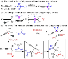 季碳中心广泛存在于复杂天然产物和药物分子结构中,尤其是炔基取代季碳中心的高效构筑一直是有机合成领域的难点之一。近年来合成化学家发展了系列通过炔基与支链单元直接偶联构建炔基取代季碳中心的方法,但大都存在末端炔较易二聚、依赖于预先功能化前体或伴随支链叔烷基单元β-H消除等不足(1-a)。本研究提出利用重氮化合物作为一碳插入合成子,通过选择性地裂解炔丙醇的C(sp)−C(sp3)来构建炔基取代季碳中心(1-b)。研究通过评估反应条件的灵敏度展示了该方法的重现性;同时也考察了该策略对炔丙醇、重氮化合物以及羧酸的适用范围,并通过核磁共振、单晶X射线衍射、高分辨质谱等进行分析表征;结合系列控制实验及密度泛函理论计算提出了可能反应机理(1-c)。