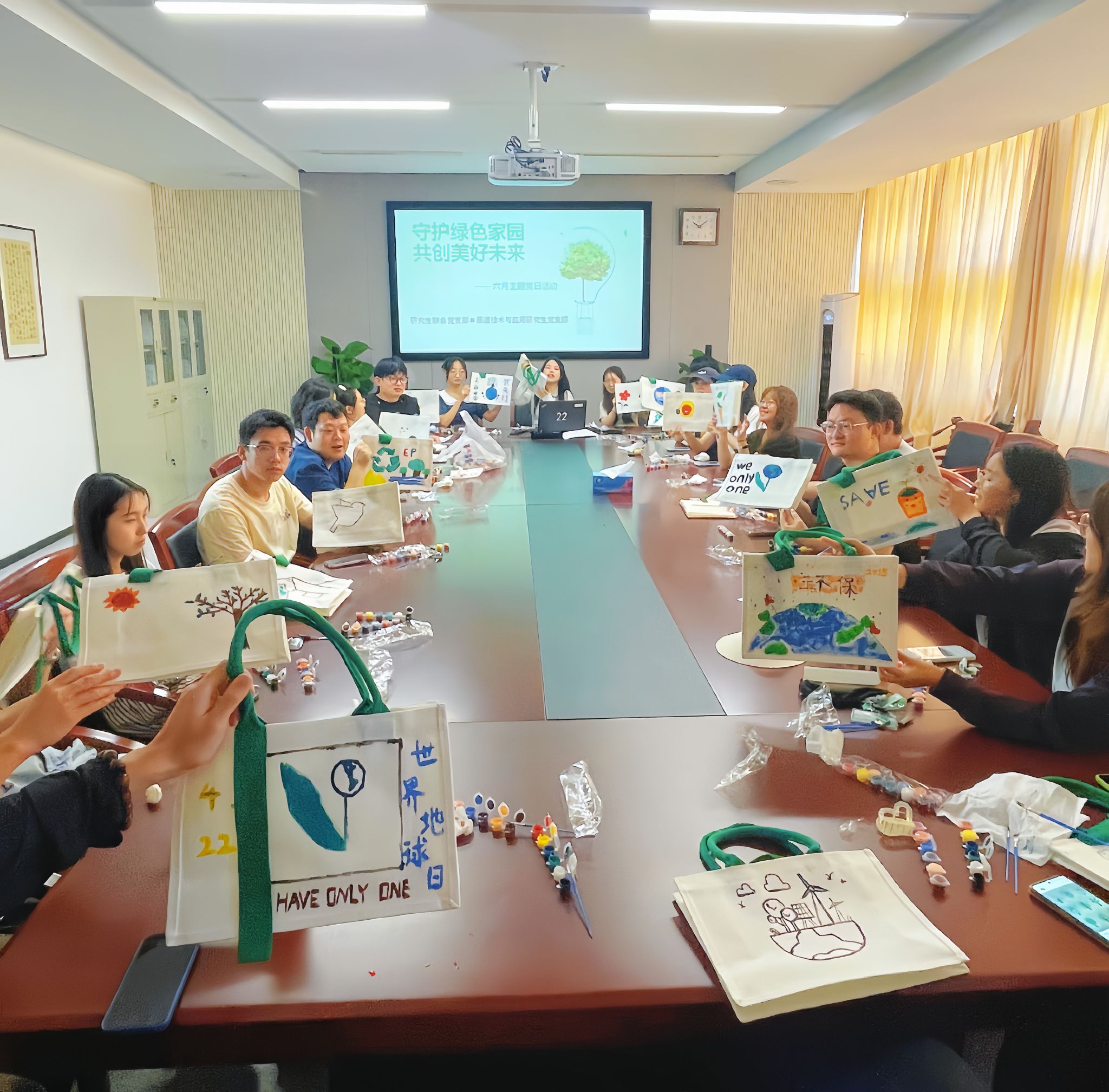 在环保主题帆布袋绘制环节,同学们化身“绿色设计师”,以画笔表达对生态文明的思考。有的勾勒出苍翠森林,寓意人与自然和谐共生;有的绘制卡通地球,呼吁保护共同家园;还有的结合专业特色,创作可降解材料分子结构图,展现科研人的环保担当。每一件作品都凝聚着对绿色未来的美好期待,传递着“减塑生活,从我做起”的环保理念。活动结束后,这些创意帆布袋将用于日常使用,让环保行动融入点滴生活。